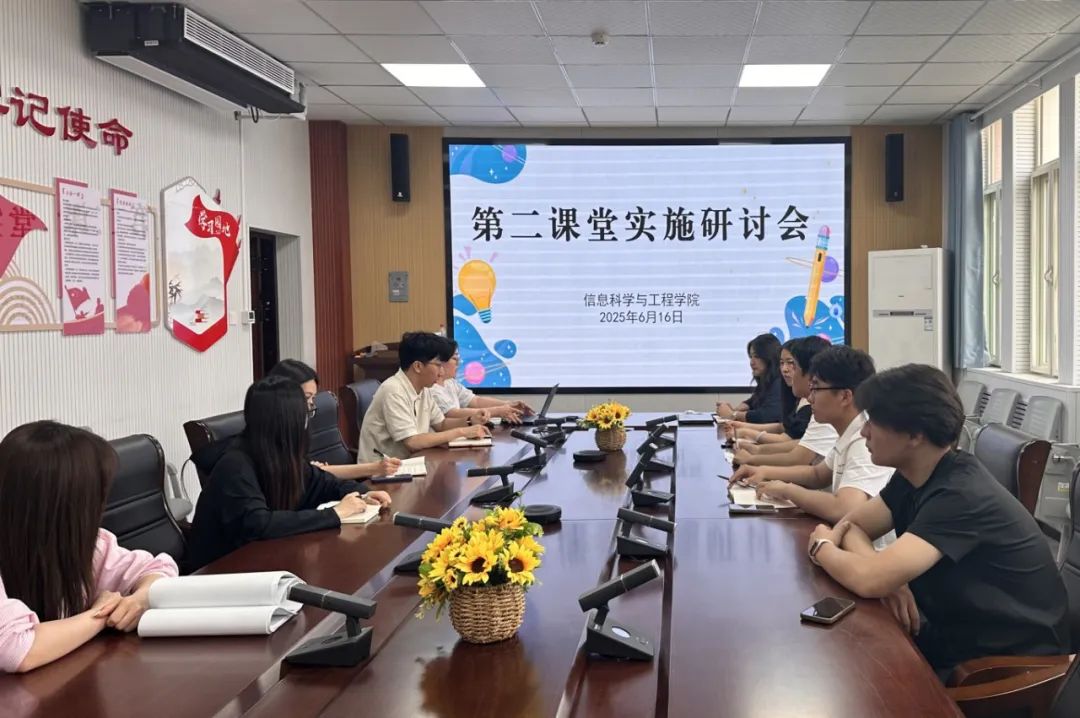 为深入贯彻基于 OBE 理念的“第二课堂”活动课程化建设指导意见,优化第二课堂育人体系,提升学生综合素质与创新能力,近日,信息科学与工程学院(人工智能学院)召开第二课堂实施研讨会及推进会。学院党委副书记姜麒麟、团总支书记李绚、团总支副书记李瑶、辅导员老师及学生干部代表出席会议。
