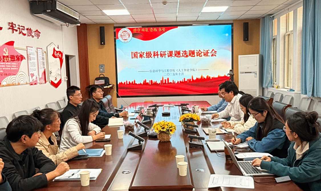 10月30日下午,信息科学与工程学院(人工智能学院)召开国家级科研课题选题论证会,泰山学者特聘专家、山东财经大学二级教授、学校特聘教授蹇木伟,山东省人工智能学会秘书长、学校特聘教授宋广乐,学院院长杜建彬、副院长梁振明以及学院博士教师代表共同参加了此次会议。