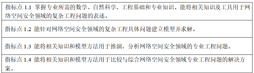 1.[工程知识]:具有从事网络空间安全工程所需的扎实的数学、自然科学、人文社会科学和工程技术理论基础,具有密码学、系统安全、网络安全、应用安全、信息内容安全等领域的系统的专业知识,具有解决网络空间安全复杂工程问题的能力。